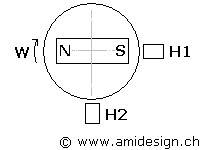 Schéma avec un aimant et deux capteurs magnétiques. Mon choix se porte sur deux ponts magnéto résistifs Philips KMZ 10 B et un aimant Alnico 3.2 x 3.2 x 19.1 mm.