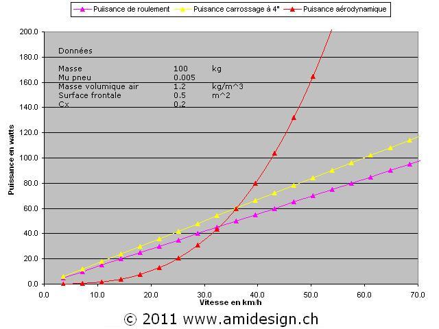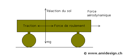 Cette dernière est négligée en partant du principe que les roues sont recouvertes d'une flasque. Pour les vélos les roues sont lenticulaires. La masse du véhicule entre dans le calcul de la force de résistance au roulement. La réaction du sol est égale à m g (masse fois accélération terrestre) en newtons. Formule pour le calcul de la force de résistance aérodynamique.