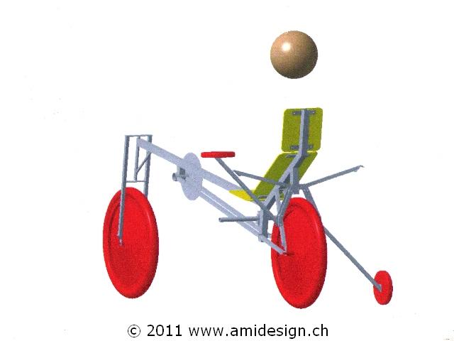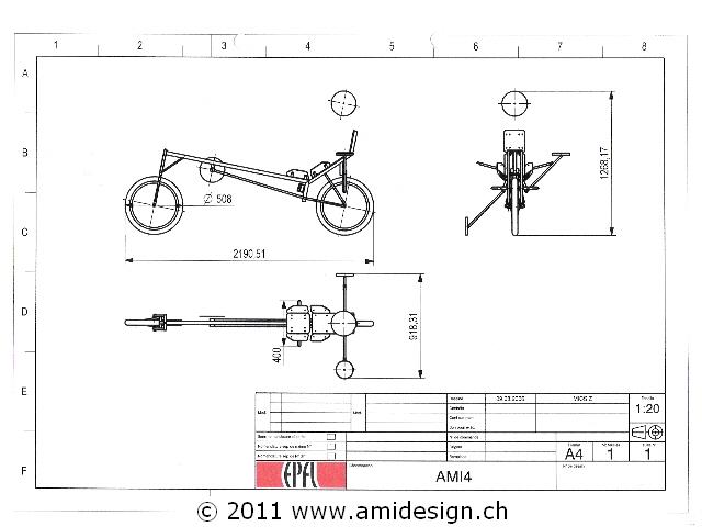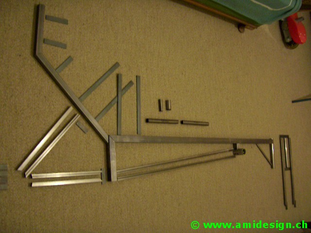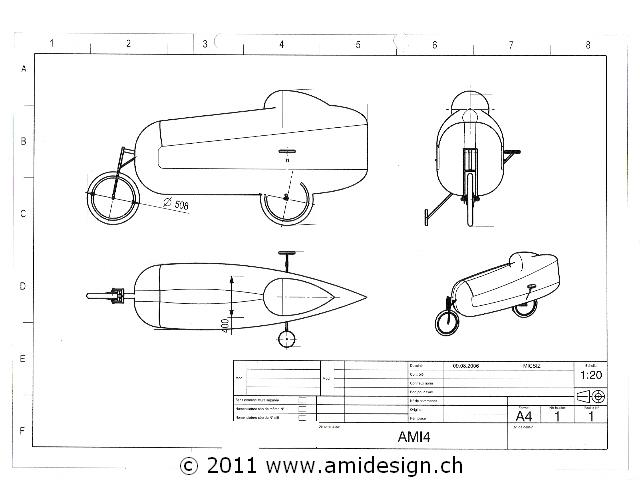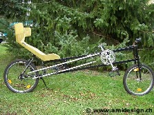 J'ai décidé de me construire, pour les vacances d'été, un nouveau vélo couché. Celui-ci reprend le concept de l'ami-lwb avec des améliorations de taille. Le cadre est plus léger et plus rigide. Les pneus sont gonflables à 7,5 bars (110 PSI) pour réduire la résistance au roulement. Le vélo reçoit une carrosserie aérodynamique avec cockpit fermé. Pour l'arrêt, un train d'atterrissage manuel et à verrouillage sort de chaque côté du fuselage. Ce vélo devrait me permettre de rouler à plat sur de courtes distances à 80 km/h grâce à un plateau de 100 dents en aluminium que j'ai fabriqué moi-même en 1999.