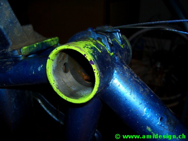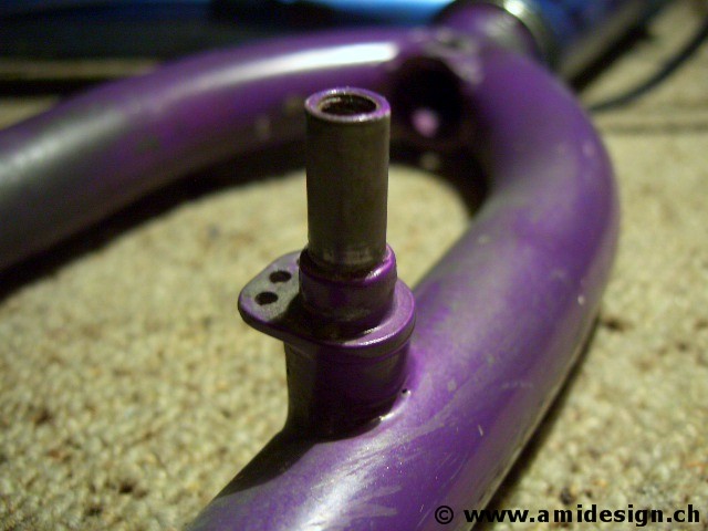J'ai acheté un vélo d'occasion. Dessus je récupère le tube de pédalier et les supports de freins. Ceux-ci sont soudés au cadre ou à la fourche. Je vais précisément les dégager au disque à tronçonner et les finir à la meule et à la lime.