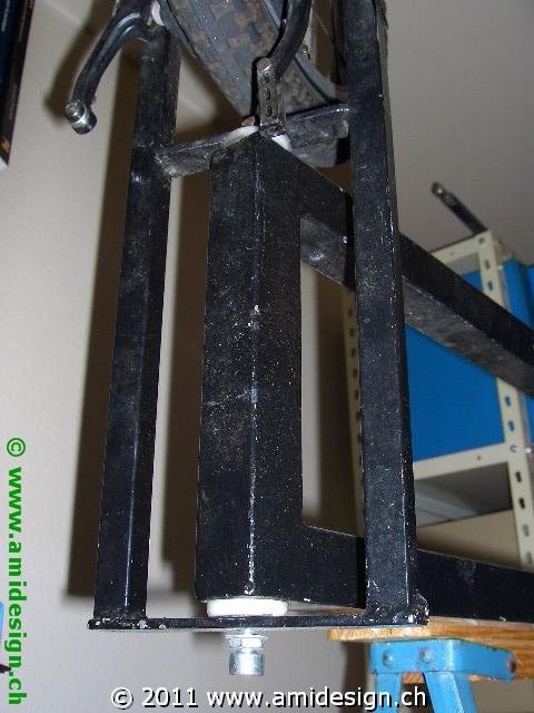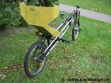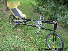 Deuxième vélo couché de ma conception. Il m'a fallu environ 100 heures de travail. J'y ai appris à souder et le siège baquet est en polyester et fibre de verre moulé. Le cadre est réalisé en fer de construction d'un profilé carré de 30x30x1,5 mm, un autre profilé carré de 16x16x1 mm et d'un méplat de 20x4 mm. Je mesure 1,79 m et il y a 0,86 m entre la base du dossier et l'axe du pédalier. Le dossier est incliné à 135° par rapport à l'axe de pédalier. Le guidon est sous le siège et une tringle va jusqu'à la fourche. Les articulations du guidon et de la fourche sont assurées par des paliers en plastique POM. Les roues sont des 20" à moyeu Sturmey Archer (système d'engrenage planétaire à trois vitesse). Son point faible est la montée car il pèse 18 kg et il n'a qu'un plateau de 52 dents. Les développements sont 3,9 m - 5,2 m et 6,9 m. Les bielles de pédale mesure 170 mm. A plat, je roule entre 20 et 30 km/h de moyenne et je suis arrivé, vent dans le dos, à 46 km/h au maximum. En descente j'ai atteint les 60 km/h à Lausanne. Les freins sont des V-brake. En montée j'ai besoin de me cramponner au guidons pour resté sur le siège. Un alternateur (communément appelé dynamo) fournit les 6 Volts pour l'éclairage. Il me permet de me déplacer les jours de beau temps. Mon parcours préféré est Ecublens - la cathédrale de Lausanne - Ecublens. J'aime aussi longer les bords du lac Léman entre Vevey et Morges. Mon plus grand tour a été Ecublens - Aigle - Ecublens (117 km). Utilisation de février 2004 à novembre 2006.