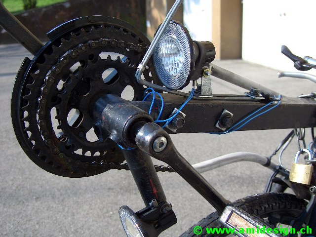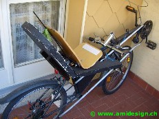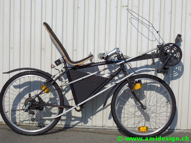 Premier vélo couché de ma conception. Très simple, j'utilise un cadre de vélo 24". Je soude à l'avant un pédalier avec un bout de tube. Le siège est en bois plissé découpé dans une chaise et maintenu avec deux équerres au tube de selle et une bride au cadre. Le guidon a une largeur de 400 mm. La potence est inversée.
