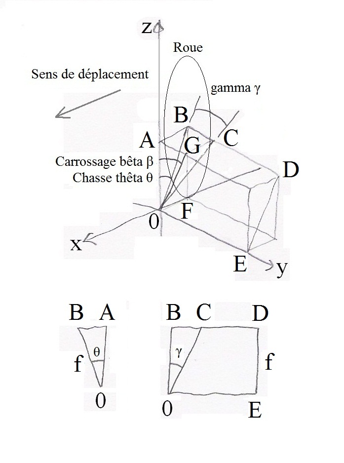 Sens de déplacement selon x. Le point de contact de la roue est en F. L'axe de la roue passe par les points B et D. Distance E0 = demi voie. BC = AG. BF = A0. Chasse thêta = arctan ( AB / A0 ). Carrossage bêta = arctan ( BC / A0 ). Longueur B0 = ( AB2 + A02 ) (1/2) . Gamma = arctan ( BC / B0 ).