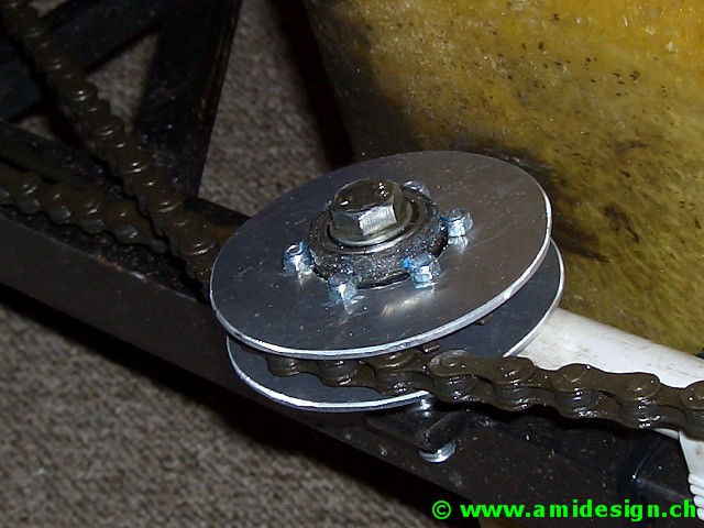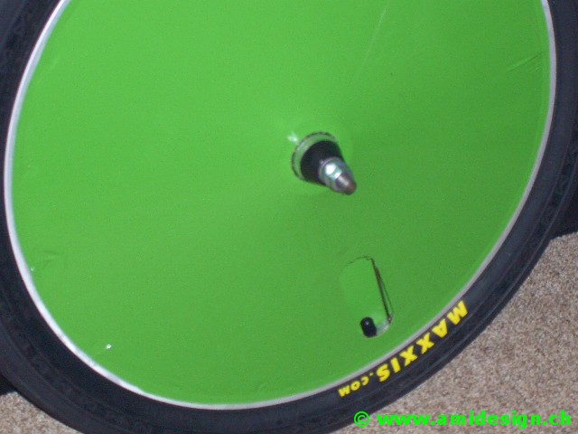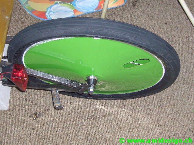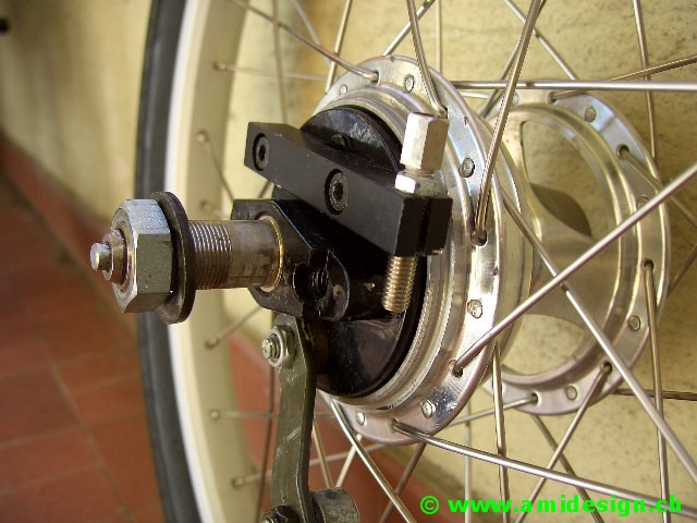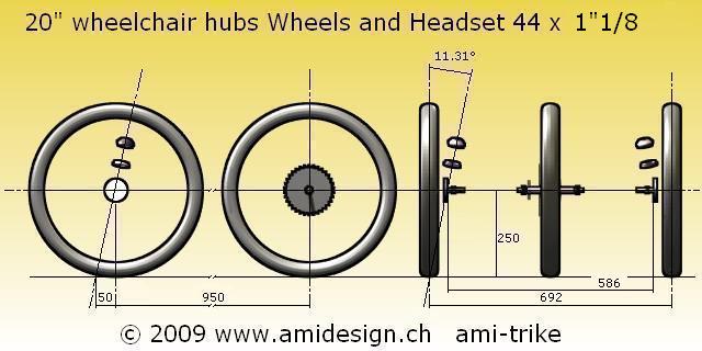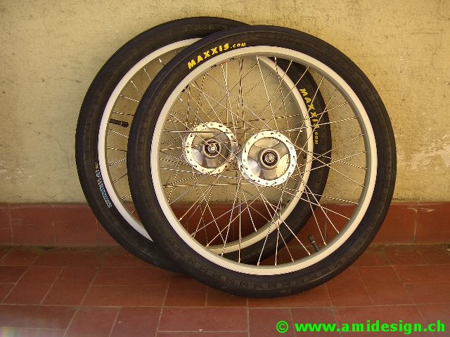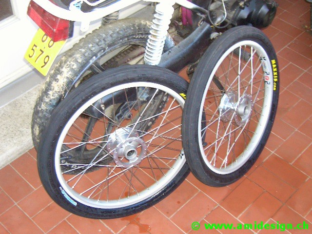 J'ai récupéré des moyeux de chaise roulante avec frein à tambour. Les jantes sont des 406-21 à 36 trous.