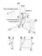 Sens de déplacement selon x. Le point de contact de la roue est en F. L'axe de la roue passe par les points B et D. Distance E0 = demi voie. BC = AG. BF = A0. Chasse thêta = arctan ( AB / A0 ). Carrossage bêta = arctan ( BC / A0 ). Longueur B0 = ( AB2 + A02 ) (1/2) . Gamma = arctan ( BC / B0 ).