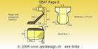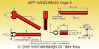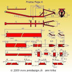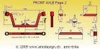 Application numérique : La roue est une 20 pouces ce qui fait 254 mm de rayon. Je choisis un écrasement du pneu de 4 mm. Donc BF = 250 mm = A0. J'impose aussi AB = BC = 50 mm. Chasse thêta = arctan ( 50 / 250 ) = 11.31°. Carrossage bêta= arctan ( 50 / 250 ) = 11.31°. Longueur B0 = ( 502 + 2502 ) (1/2) = 255 mm. Gamma = arctan ( 50 / 255 ) = 11.1°.