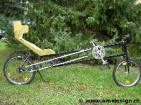 The second born of my conception. This HPV (Human Powered Vehicle) has a steel frame. It needs about 100 hours of work. I learned the welding process on it and the seat is in molded polyester. It allows me to have journey during sunny days. My favorite journey is Ecublens - The cathedral of Lausanne - Ecublens. My longest journey is Ecublens - Aigle - Ecublens (73 mi). I like traveling along the Geneva lake or go to Morges. Its weak point is climbing because of its 40 lb weight and only tree speeds system. The average speed on the level is 15 Mph and my maximum speed is 28.6 Mph. On downhill it works admirably and I reach the 37.3 Mph. It has 20" wheels.